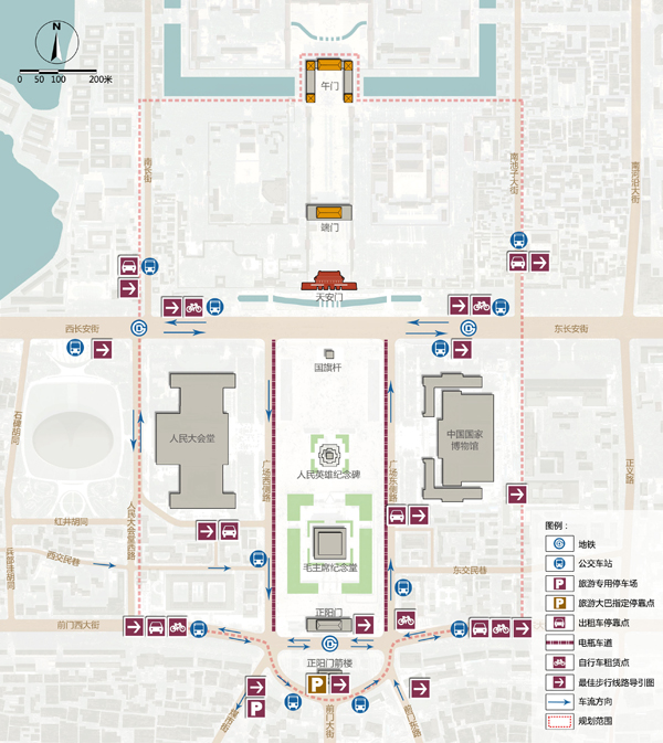 在旅游服务提升方面,方案分别以“智慧天安门、人本天安门、人文天安门、人和天安门”为命题,重点构建智能化旅游信息系统、人本化旅游设施系统、主题化广场景观系统和仪式化游赏组织系统,形成“一主三辅”四大旅游服务体系,全面提升天安门地区旅游服务品质。其中,“智慧天安门”智能化旅游信息系统,首次提出将GIS、无线网络等现代信息技术运用到天安门地区的旅游信息发布、游客管理、环境监控、安全管理等各个方面,构建面向游客和管理者的双向信息服务体系,从而实现天安门地区游赏服务和旅游管理的智能化,最大限度地解决由于天安门地区多头管理并存、游客规模庞大、管理任务繁重、信息渠道不畅、游赏便捷性不足等带来的诸多问题,形成了整个方案的创新亮点。在构建“一主三辅”四大旅游系统的基础上,远期还将实施“前门-广场—故宫无障碍步行廊道打造工程、环广场特色旅游交通系统构建工程、广场东南片区旅游特色街区改造工程、广场休闲绿地拓展工程、广场地下旅游服务空间开发工程“五大远期项目,将天安门广场打造成为人民的广场、时代的广场、休闲的广场和绿色的广场。