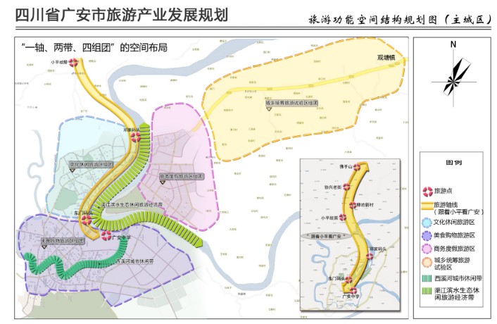 规划将广安现有的红色旅游一枝独秀,转化为红绿金古四色旅游齐头并进的产品格局,实施红色旅游升华创新扩容、绿色生态休闲旅游深度开发,金色商务会议度假旅游跨越式提升、古色古镇文化度假旅游特色化发展的后观光时代的旅游产品新格局。