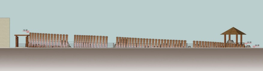 天涯书简,以古代书简为设计元素,是展示天涯书院浪漫气息的存在,一排倾斜生长的竹简代表着天涯海角这块文化土地的肥沃和无私的抚育,给人以蒸腾向上的感觉,在为天涯书院平添文化气息的同时增添了书院不少历史氛围。天涯书简充分挖掘历史文化元素,结合现代自然生态环境,共同打造天涯海角景区浪漫的文化宫殿。天涯书简的通透性使得整个空间成为半私密开敞空间,丰富了空间的节奏感和韵律感;而且,古色古香的书简,富有高质量的文化和艺术气息,古典与现代的完美结合使其成为天涯文化区的一大突出亮点。