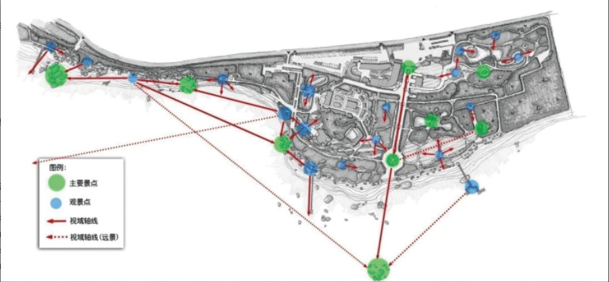 规划的游客服务中心、售票厅、停车场、休憩园林和出口商业街等,将下客点、停车场入口和出口分置,有效疏散了出入口的交通。同时,为了实现人车分流,将道路按功能分级,设计了主干道、一级园路、二级园路,组织空间、引导、联系并串联景点及休憩场所。在游览线路组织方面,通过串联景区内主要景观区域及景点,强调使用功能、景观效果和游赏体验。园路设置形成环线,观赏面大,有利于游客游览;有的园路设计成“斗折蛇形”或“一曲一改观”,追求隽永深邃的意境,增加景区的空间层次。