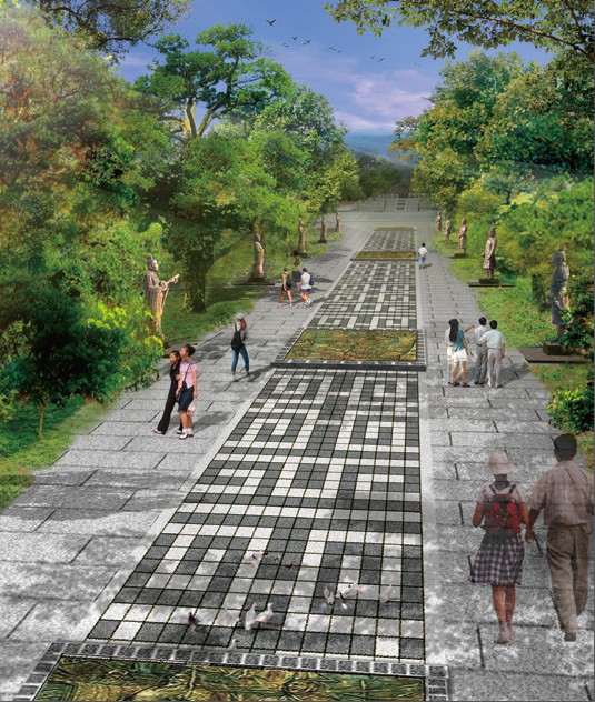 广场规划设计充分考虑了莲花台景区特点,将秦皇祭天引入设计理念,开发多项可参与性活动,有效地带动景区发展,形成景区入口、文化标识性旅游项目。根据“一道通天、两翼归心、##演绎”的空间布局,对六国归秦、祭天大道、九州祭台、苍天福佑、文武两翼、天溪流泉等七大重要节点进行项目建设。