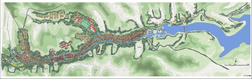 在总体空间形态上,规划将场地内山形水系、道路交通等线状肌理和与古镇的五大功能区在空间上相叠加,形成“玄武胜境”,彰显古镇作为玄武水神圣地的文脉关系,为水库移民营造一个具有鲜明武当文化印象的和谐、宜居福地。