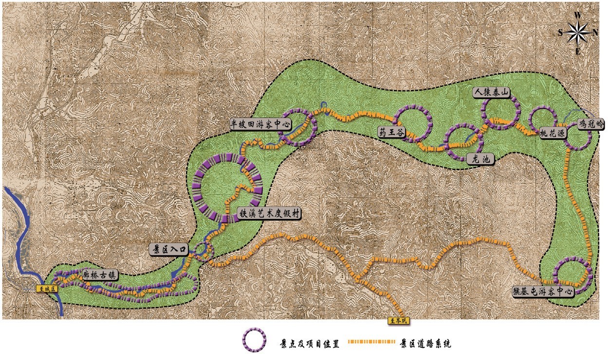 规划构建铁溪景区四区四点结构体系:四大旅游功能区,即“廊桥古镇”、“度假休闲区”、“游览观光区”和“溪谷探险区”;四个重要节点,即“艺术度假村”、“药王谷”、“龙池”和“桃花源”,它们共同支撑铁溪景区休闲度假的功能,依托优美的溪流风光,根据《儒林外史》描述的故事情节以及幽静的峡谷风貌,按照“神奇、神秘、神圣”的意境设计,以“秘境乐土·歌舞胜地”为形象,以打造AAAA 级旅游区为目标,将景区建设为一个融休闲度假、观光体验、秘境猎奇于一体的生态探险旅游区。规划准确地把握了铁溪风景区的资源特色与文化本底,立足高远,方案切实落地,受到委托方的一致好评。