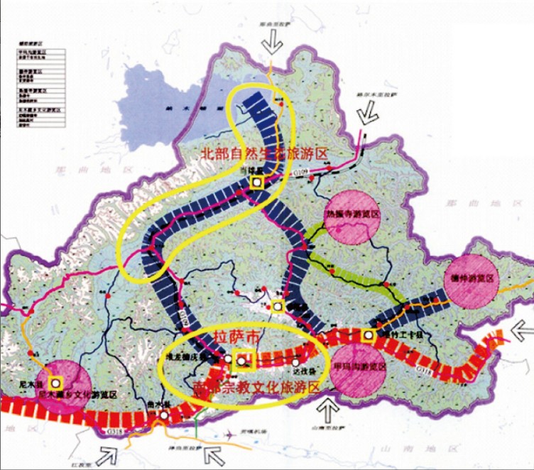 拉萨作为藏传佛教的中心,宗教文化对城市形态和建筑形式都具有深刻的影响。拉萨古城现状以大昭寺为核心的放射状街道格局,由于朝圣而形成的囊廓、八廓和林廓三条转经环路,构成了古城的独特城市肌理。规划重视宗教文化在古城旅游开发中的地位和作用,提出将转径路打造为古城旅游系统的骨架,古城旅游的观景廊道和游客古城体验的线路。