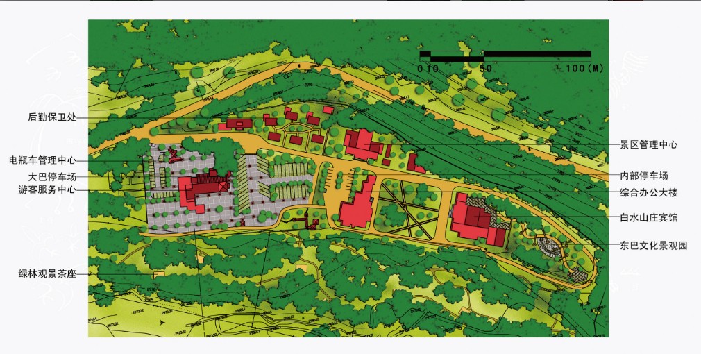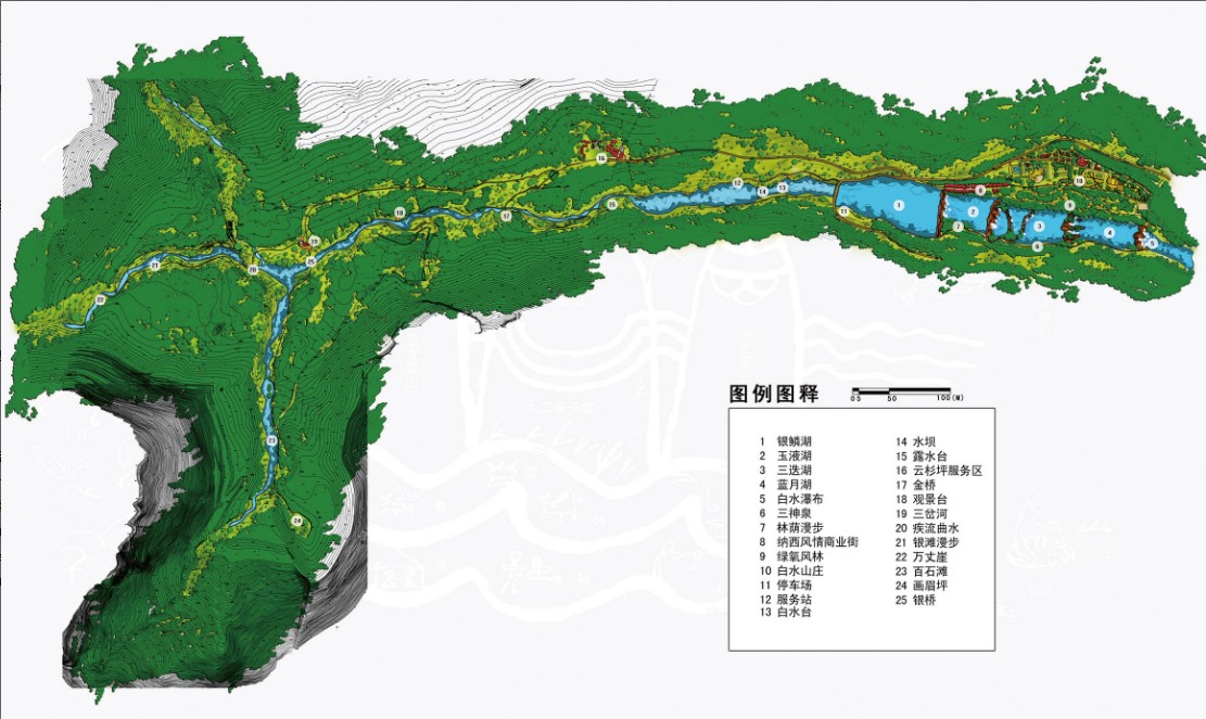 规划以“翡翠仙境,神山之乳”作为景区旅游形象宣传口号,并将其纳入到功能和景观系统结构中。规划将景区功能分区为溯源朝圣区、银滩徒步游览区、蓝水游憩区、画眉坪生态游览区以及包括综合服务设施在内的白水山庄休闲度假区;并将景观系统细分为“一轴、两翼、四点”,所谓一轴是指中下游视觉景观轴、两翼是指画眉坪丛林生态景观翼和马尾瀑源头生态景观翼、四点则为水景、生景、台景和坝景。