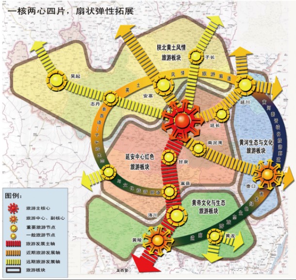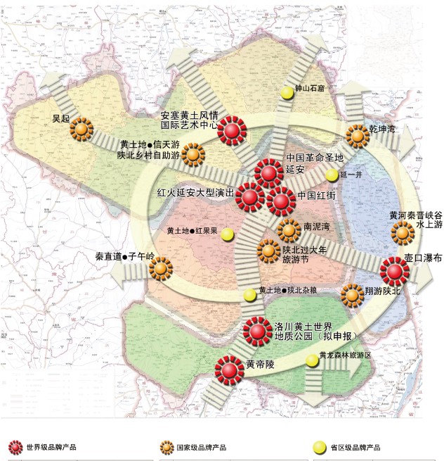 延安是举世闻名的中国革命圣地,中华民族圣地,素以“两黄(黄土文化、黄河文化)两圣”旅游资源著称于世,但目前旅游产品结构单一、同质化严重、区域竞争激烈,成为旅游发展的制约因素。针对这一问题,规划提出了延安旅游的“品牌驱动”战略,挖掘资源优势,形成以“两黄两圣”为主的五大世界级旅游品牌、八大国家级旅游品牌和四大区域级品牌产品,实现从资源到产品的有效转化。规划设计的世界级旅游品牌产品包括:“天下第一陵”黄帝陵;“红色圣地”延安革命文化遗产保护地;“天下黄河一壶收”壶口瀑布;“红火延安”大型演出;安塞黄土风情国际艺术中心。