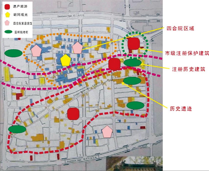 大栅栏历史街区建于明永乐18 年,属于《北京旧城历史文化保护区保护和控制范围规划》规定的25 个历史文化保护区之一,大栅栏保留了原有街区胡同的特色,大栅栏西街-铁树斜街、杨梅竹斜街-樱桃斜街等整个街区框架体系,反映了从金中都、元大都到明、清两代北京城变迁的历史足迹。北京城市总体规划(1991~2010)中曾将大栅栏定位为与西单、王府井同级的“市级商业中心”,但是这一规划效果并不理想,商业定位遭遇尴尬。2002 年,宣武区政府为对该地区进行改造更新,并拟向世界银行申请贷款项目。受世界银行委托,北大旅研吴必虎教授与来自丹麦的咨询专家艾利克·皮特森(Petersen Erik)博士承担世行项目《北京大栅栏文化旅游商业区规划》。在大栅栏历史街区的城市更新研究基础上,指出大栅栏地区的商业发展模式即“遗产导向型旅游业和旅游导向型商业模式”,实现这类地区的保护和发展双重目标。规划认识到,在对大栅栏历史街区进行更新改造的过程中,最为关键的决策是交通规划。大栅栏区域并没有必要承担过多的城市干道交通输送过境客流的功能。规划最后提出,大栅栏地区开发目标应该是建设城市度假目的地,其依托就是以四合院为基础改造而成的家庭宾馆。