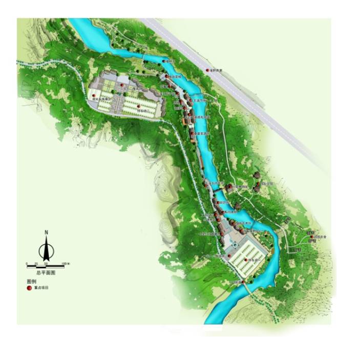 溪谷+建筑游憩空间:依托山势及平台空间,结合当地吊脚楼和传统古镇建筑,突出峡谷情怀、古镇历史、商埠文化、码头特色。建筑与动感的峡谷山水巧妙融合,形成动与静、整齐与活泼的鲜明对比。以再现画境的方式建设谷内建筑,主要用以打造特色游憩及休闲度假空间。从总体布局到建筑形体严格遵守自然法则,以不破坏峡谷景观、不撼动古镇文化为根本。