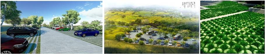 乡村旅游交通的配套设施包括停车场、服务驿站、道路标识系统等,容量应满足游客接待需要,在建筑理念上应以生态环保为首要考虑因素。以停车场为例,按集中和分散两种方式进行停车场配置,村庄主入口或游客接待中心附近区域应设置大型生态停车场(可供旅游大巴车停放),村庄内可根据需要设置小型生态停车场,各类停车场的选址合理,规模适中,与周边环境协调。