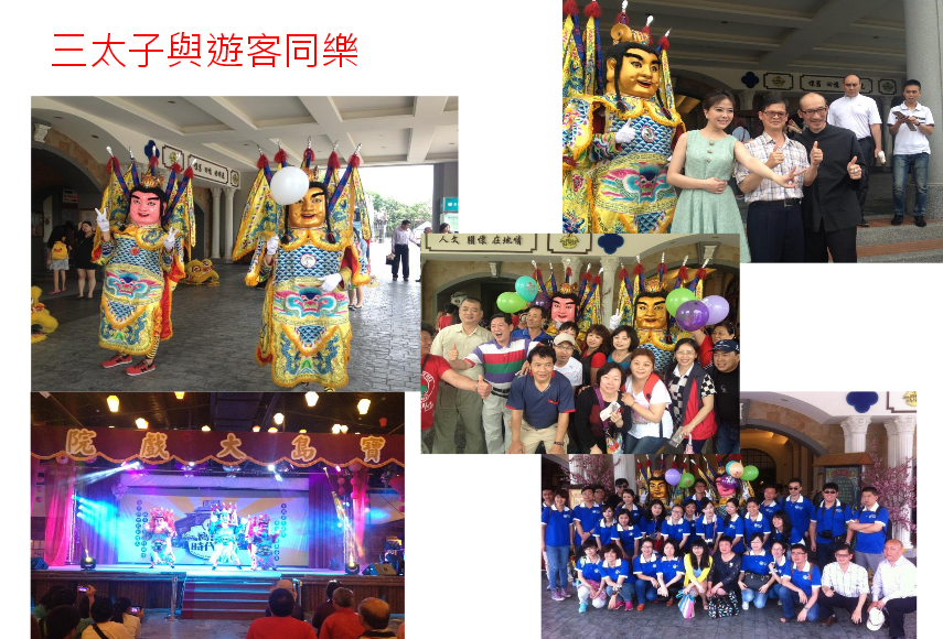 在南投草屯镇,有一家号称是文创商店街,名叫“宝岛时代村”,当然,此处所指的宝岛就是台湾。“宝岛时代村”将民国五十年代的农村聚落的商店景象搬到“宝岛时代村”, “宝岛时代村”的迎宾、送客活动,就是最能代表台湾传统的电音三太子表演,边走边跳,一边穿梭与游客群中,游客争相抢着要跟三太子合照相,人气指数非常旺,充分达到集客效果;值得一提的是,“宝岛时代村”里头的舞台秀,也电音三太子在跳街舞,呈现异类风格的表演。两年前,厦门大学MTA移动学堂来到“宝岛时代村”考察,看得心花怒放,也争相与三太子照团体照,留下难忘民俗娱乐方式。