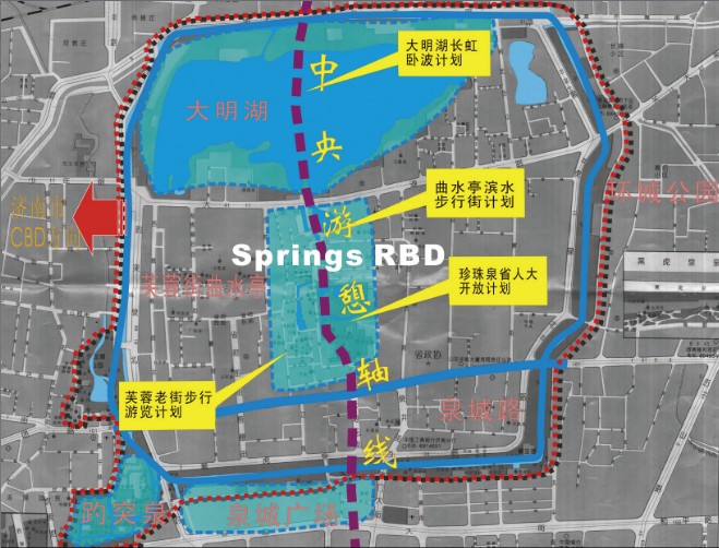 在规划提出的泉城中央游憩区的理念指引下,从2007 年起,济南市预计投资84 亿元,在老城区全面建设泉城特色标志区,打造三大特色片区:一是以黑虎泉、趵突泉、五龙潭、大明湖、泉城广场和珍珠泉泉池园林景观区;二是芙蓉街-曲水亭街地方传统历史街区;三是将军庙街区、泉城路、南门地区商业中心区。