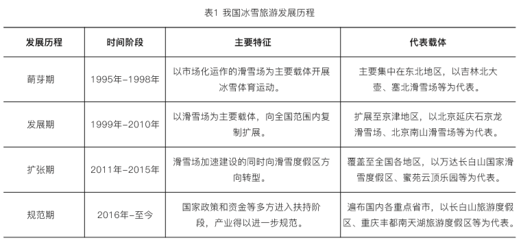 国内冰雪旅游于1995年进入萌芽期,1999年进入发展期,2011年开始进入五年扩张期,2015年冬奥会成功申办,冰雪运动开始进入加速期,冰雪旅游也开始进入规范发展阶段,各阶段的发展时间阶段、主要特征、代表载体如表1所示。