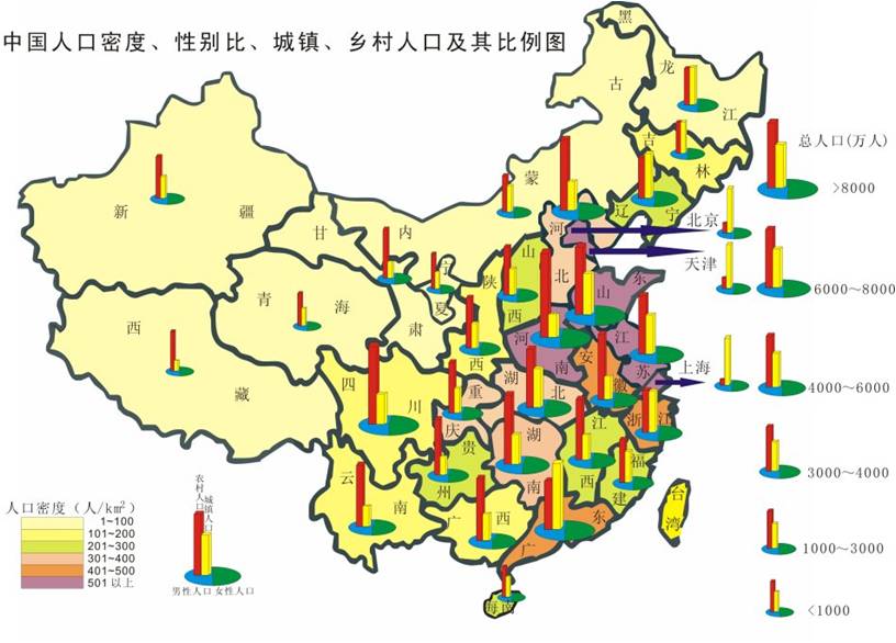 中国人口密度、性别比、城镇、乡村人口及其比例图 来源:新浪博客