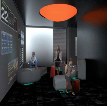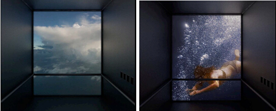 电梯设计:超写实的视觉电子屏幕浮现在电梯之中,随着电梯的上下而浮现纯视觉的体验,让客人感受到科 技的奇妙和不敢相信的错觉。