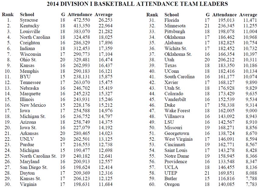 2014年美国大学男子篮球队观众人数排名(数据来自NCAA)