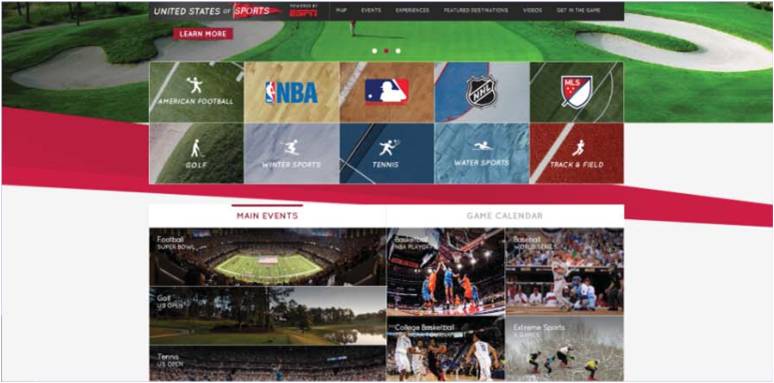 美国有一个著名的网站平台,网站专门有一板块是关于体育旅游观光的,美国最主要的几项体育运动——篮球、棒球、橄榄球、网球、冰球、足球等的一些信息可以在这里找到。它把各种体育项目作为体育旅游的促销手段,让人清楚地看到体育旅游市场的切入点在哪里。