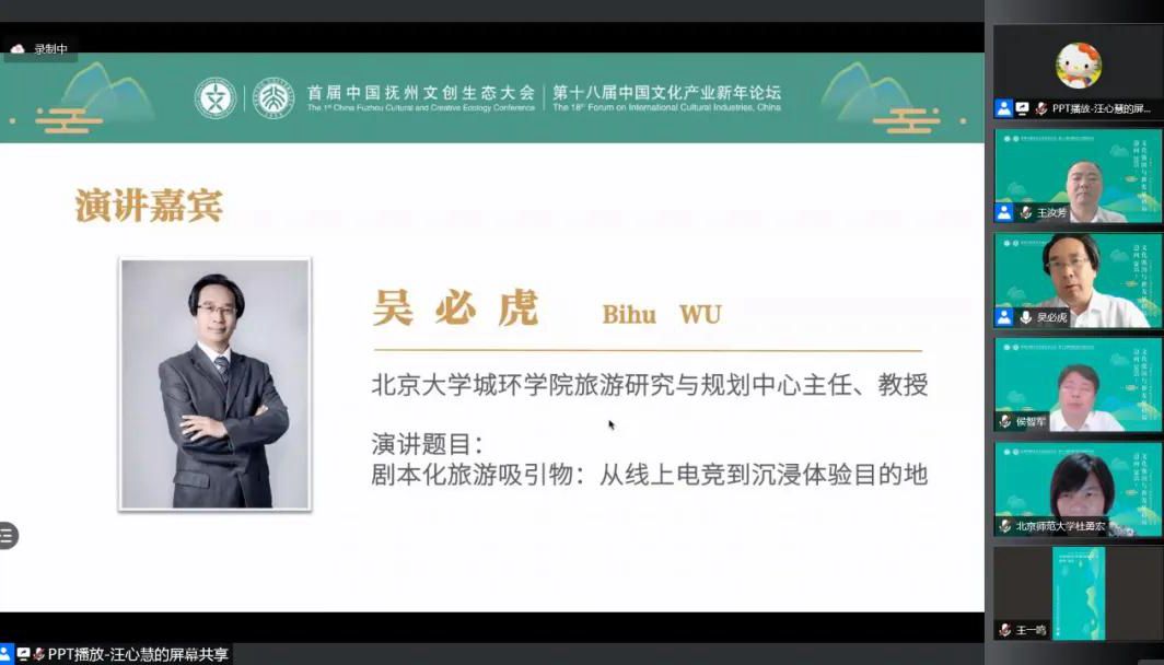 8月16日,2021首届中国抚州文创生态大会暨第十八届中国文化产业新年论坛以线上会场、北京大学、江西抚州线下分会场连线联动的方式举办。北京大学城环学院旅游研究与规划中心主任、文化和旅游部十四五规划专家委员会委员吴必虎教授受邀出席并发言。